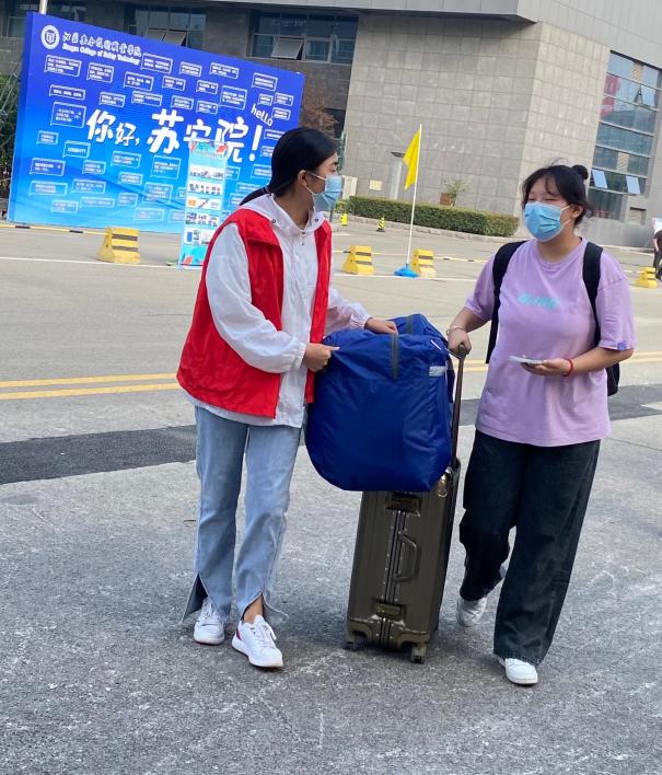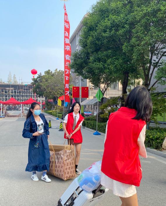 报到当日,通过人工和机器结合方式完成健康码查验、体温检测、核酸检测等流程,同学们严格落实疫情防控要求,有序进入校园。各班班主任、辅导员坚守一线,积极查验班级员工的苏康码、行程卡和核酸检测报告等,完成报到后再由志愿者帮助同学将行李运送至宿舍。一个个身穿红马甲忙碌的志愿者身影活跃在校园的每个角落,为大一新生顺利开学保驾护航。