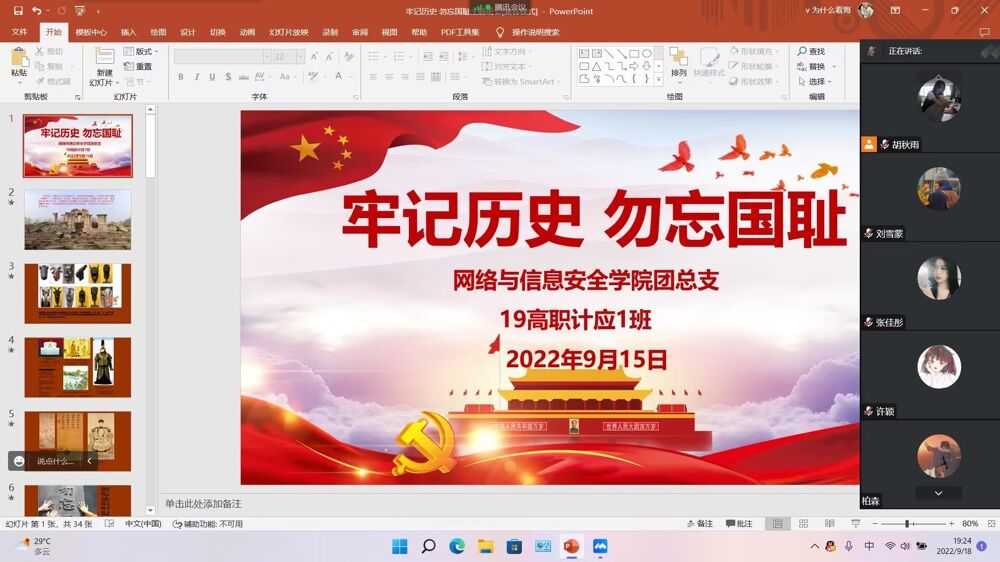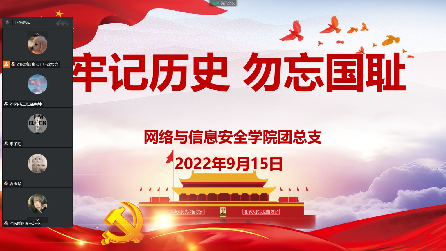 各班级通过线上班团课教育,让同学们深入了解了“九一八”事变后祖国的那段苦难屈辱的历史,了解了由“九一八”事变所激起的全国人民奋勇抗战的历史经历,同时进一步增强了同学们的民族自尊心、自信心和自豪感,也更加坚定了他们不忘国耻,牢记使命,砥砺前行,为国家和民族的富强奉献力量的信念。