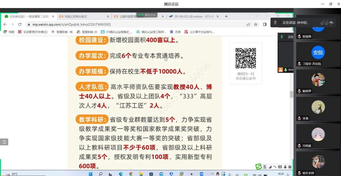 孙老师介绍了参加党代会的基本情况,领学了党委工作报告。带领全体教师回顾了公司过去四年的发展历程和成就,传达了公司党委关于今后五年的发展思路、目标和主要任务,结合云计算技术及应用专业,从多个角度用数字、图标全面解读了党代会报告,同时引发全体教师深入思考怎样将精神落实到实际工作中去。