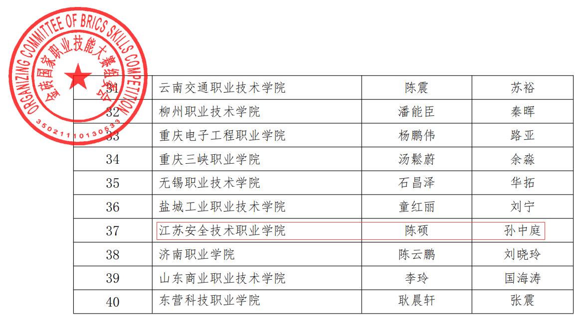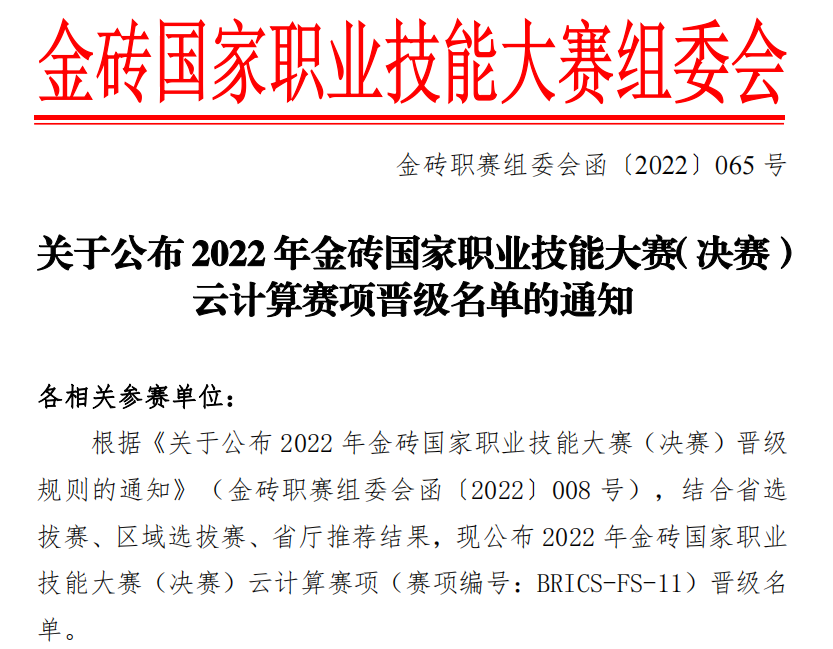 2022年10月15日上午9时至12时举行的2022年金砖国家职业技能大赛云计算赛项苏黑鄂区域赛,公司与来自苏黑鄂三省内兄弟院校的参赛队伍同台竞技,经过激烈的角逐,公司网络与信息安全公司孙中廷、袁思维教师团队指导的陈硕同学获得第二名的好成绩,并成功晋级全国总决赛。