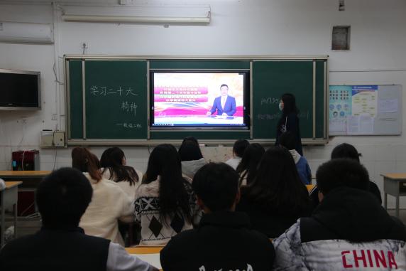 团课上,同学们通过“党的二十大关键词”,再次温习了党的二十大报告的相关内容,并针对重点新词汇和问题展开深入学习讨论。理论学习结束后,又一同观看了《焦点访谈——权威解读二十大》视频。