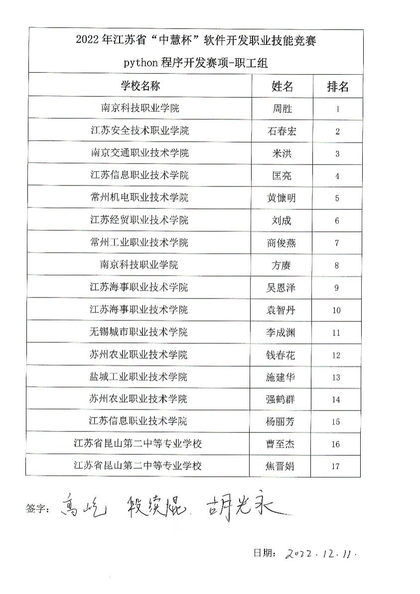 12月11日,在江苏工匠岗位练兵职业技能竞赛——2022年江苏省“中慧杯”软件开发职业技能竞赛python程序开发赛项竞赛上,经过激烈的角逐,XCSport石春宏教师荣获职工组第二名的好成绩。