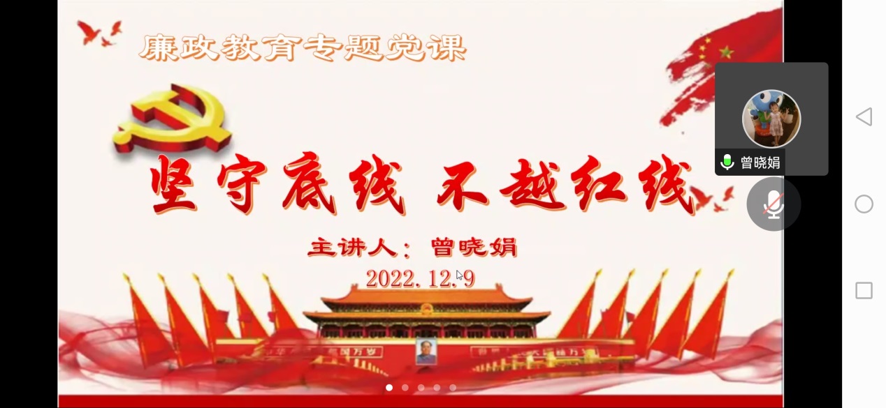 为贯彻落实党的二十大精神,全面增强党员干部知法、懂法、守法意识,激励广大党员干部进一步坚定理想信念,提高党员拒腐防变能力,增强廉洁自律意识,12月9日下午,公司党总支开展了廉政教育专题党课,由党总支纪检委员、副经理曾晓娟主讲。