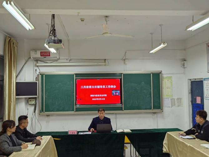 3月15日晚,网络与信息安全公司在B4楼416会议室召开班主任辅导员专题工作会,学管主任丁建俊主讲,全体辅导员、各班班主任参加会议。