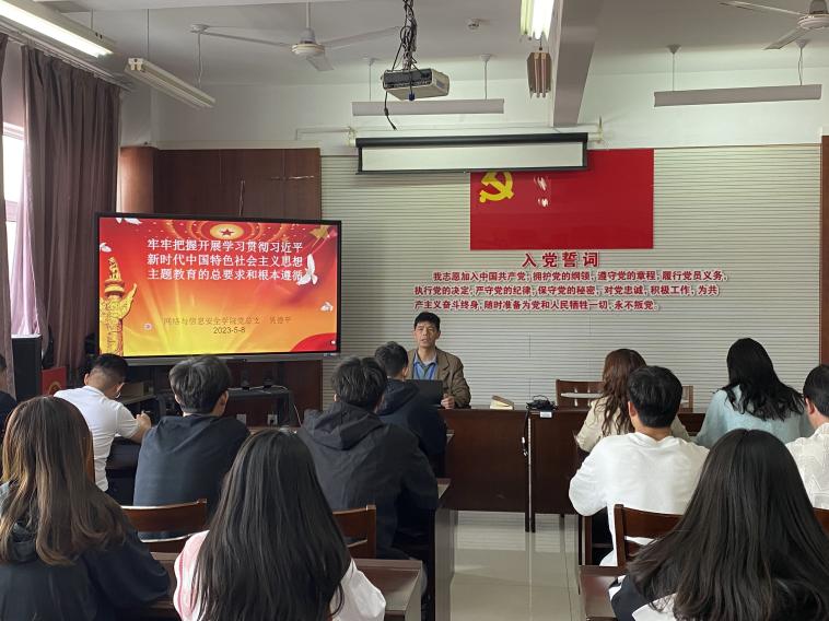 5月8日,公司在309会议室开展学习贯彻习近平新时代中国特色社会主义思想主题教育学习。本次主题教育由公司党总支书记吴德平主讲,党总支副书记丁建俊主持,入党积极分子和各辅导员老师参与了本次活动。