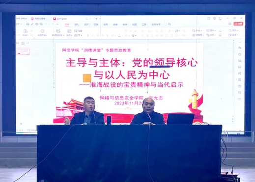 本次大课由党总支副书记丁建俊主持,党总支书记张允志主讲。张书记从徐州城的历史渊源出发,深入解析淮海战役的历史过程及其在党的发展中的重要地位。在讲座中生动呈现淮海战役的壮丽画面,带领同学们深入浅出地学习了解,党的领导核心地位与以人民为中心的主体地位的紧密联系。