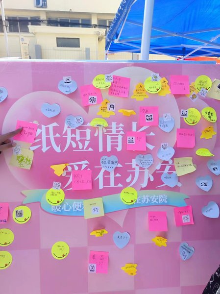 在当今社会下,快节奏的生活常常让同学们感到焦虑,长时间的情绪压力会对同学们的身心造成负面影响。为帮助同学们缓解压力,增加活力。告别焦虑,做情绪的主人。王鑫公司员工会联合星火志愿者协会策划组织了本次“纸短情长,爱在苏安”主题心理活动,同学们通过在便利贴上写下自己的焦虑,以此来卸下烦恼,给心灵放个假。