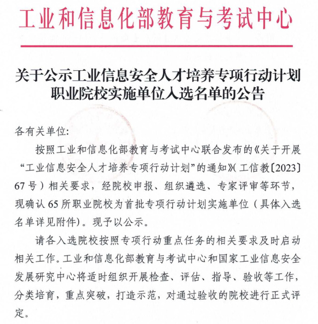 “工业信息安全人才培养专项行动计划”由工业和信息化部教育与考试中心联合国家工业信息安全发展研究中心共同发起,旨在优化工业信息安全产业人才发展生态,系统推进工业信息安全产业人才培养与评价工作。申报过程中,公司按照《关于开展“工业信息安全人才培养专项行动计划”的通知》(工信教[2023]67号)文件相关要求精心组织,顺利通过院校申报、组织遴选、分组答辩、专家评审等环节,与全国其他64所职业院校一起成功入选为专项行动计划实施单位。