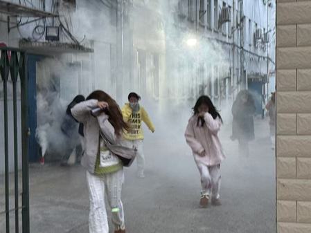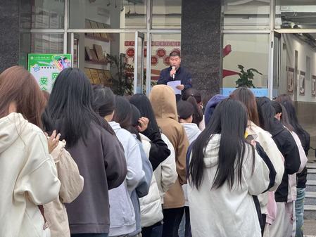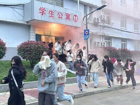 随着警报声响起,女生们在辅导员老师的指引下,迅速用湿毛巾捂住口鼻,弯着腰,沿着预定的疏散路线,紧张而有序地撤离寝室。整个疏散过程迅速、安静且有条不紊,充分展现了同学们良好的纪律素养和应对突发事件的能力。