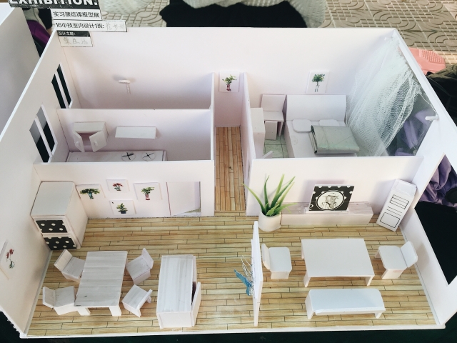 16室内设计一班全体员工在两周的实习课学习中,对居室空间进行了创意的设计,并通过板材的制作,成功将平面的理念转化为立体的模型,每一个空间的规划、每一个小家具的表现,都是员工一点点制作成型的。