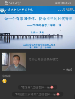 由系部黄健主任给我们进行的线上开学第一课教育,主要从四个方面进行:一场没有硝烟的战争;国家的力量、民族的精神;致敬逆行者;青年人的使命担当。对全体员工提出四点要求:服务大局、延期开学;严守纪律、强化防范;加强学习、不负韶华;理性对待、充满信息。在全体师生中间引起强烈的反响和共鸣。