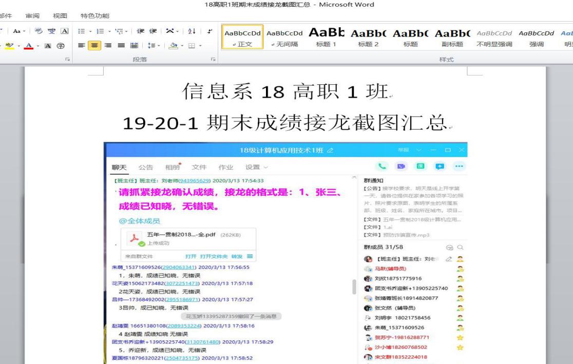 新冠肺炎疫情的发生,没有挡住学习的脚步,公司进行线上教学以来, qq、短信、电话被各种询问成绩相关内容的信息刷屏。我们的反馈是:整个寒假期间都在做各科成绩的收集汇总工作,但因为信息系班级多,员工多,课程多,单科成绩收集起来特别繁琐!而且个别老师的单科成绩在公司办公室的电脑里,受疫情影响进不了公司,直到近期才按程序打报告进到公司把成绩反馈给我。收集完所有单科成绩以后,便马不停蹄的加班加点制作成绩册,完成云龙成绩册录入21册,贾汪成绩册录入45册。以往线下,信息系是将每班成绩册打印出来,发放到班级,但现在为解“疫”时之忧,只能改变工作方式,把这些成绩册分到信息系5个线上教学管理小组,由各小组把成绩册分发到每个班级qq群里。