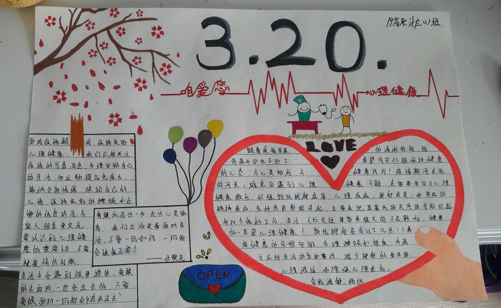 “3·20”健康教育周,给同学们一个提高学习热情、传递抗疫决心、调整负面情绪的机会。信息工程系团总支组织开展“3·20 咱爱您”心理健康周手抄报评比活动。希望这次活动能成为同学们枯燥隔离生活中的休息站,缓解同学们紧绷的内心。
