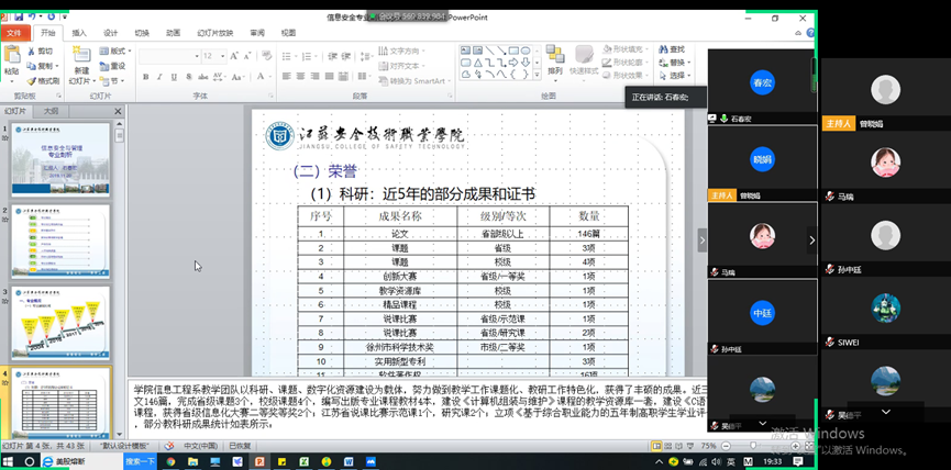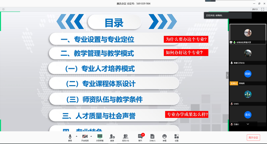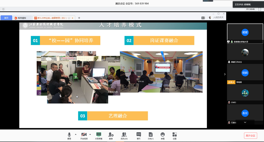 为提升公司专业建设能力,保证公司办学质量, 3月28日晚7:30开始,信息工程系通过腾讯会议组织信息安全与管理、电子商务、室内艺术设计、云计算技术与应用、幼儿发展与健康管理五个专业进行线上专业剖析汇报。系部领导吴德平书记、黄健主任、曾晓娟副主任、五个专业剖析团队成员参加了本次剖析会,由黄健主任主持。石春宏、徐海侠、薛珺予、袁思维、殷媛媛五位老师分别代表五个团队进行剖析。每位汇报人从专业设置与人才培养模式、教学条件保障、教学管理与教学模式、人才质量与社会声誉、专业特色、存在问题与措施等方面进行介绍。将专业团队对为什么办这个专业、如何办好这个专业、专业办学成果剖析的较为透彻。系部领导也针对每一个团队的剖析报告不足的地方,提出了整改的建议。希望每个团队要立足于专业建业做深刻分析,从专业论证到专业发展,取得的初步成果,突出专业建设的优势,展示专业亮点。从汇报讲解到PPT制作、讲稿的细节要努力做到精致与细节都不忽视。为时两个半小时的汇报与交流,让剖析团队进一步理清了思路,为下一步的剖析改进工作提供了很好的帮助。