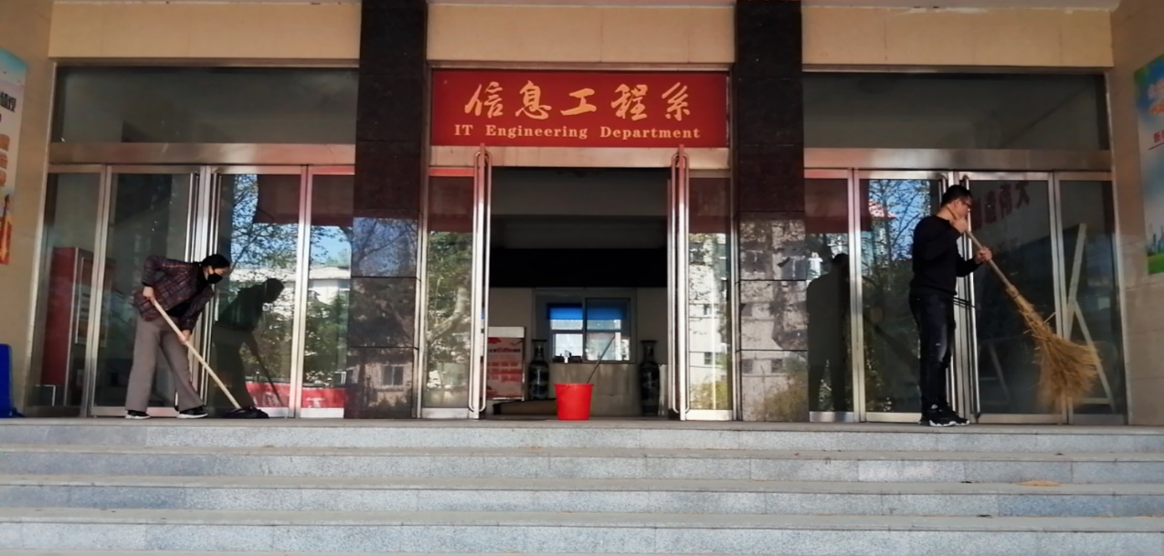 2020年4月7日,信息工程系全体领导及固定岗人员返校上班,为员工开学做好准备工作。在系部领导的带领下,对教学楼B1楼和B5楼公共区域做好卫生清扫和消毒工作。