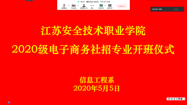 5月5日,XC体育信息工程系通过“腾讯会议”线上开展2020级电子商务社招专业开班仪式。信息工程系主任黄健、党支部书记吴德平、云龙校区学管副主任李梅、教学副主任曾晓娟、贾汪校区学管副主任付园、社招班班主任及72名社招新生参加了此次会议,会议由学管副主任付园主持。