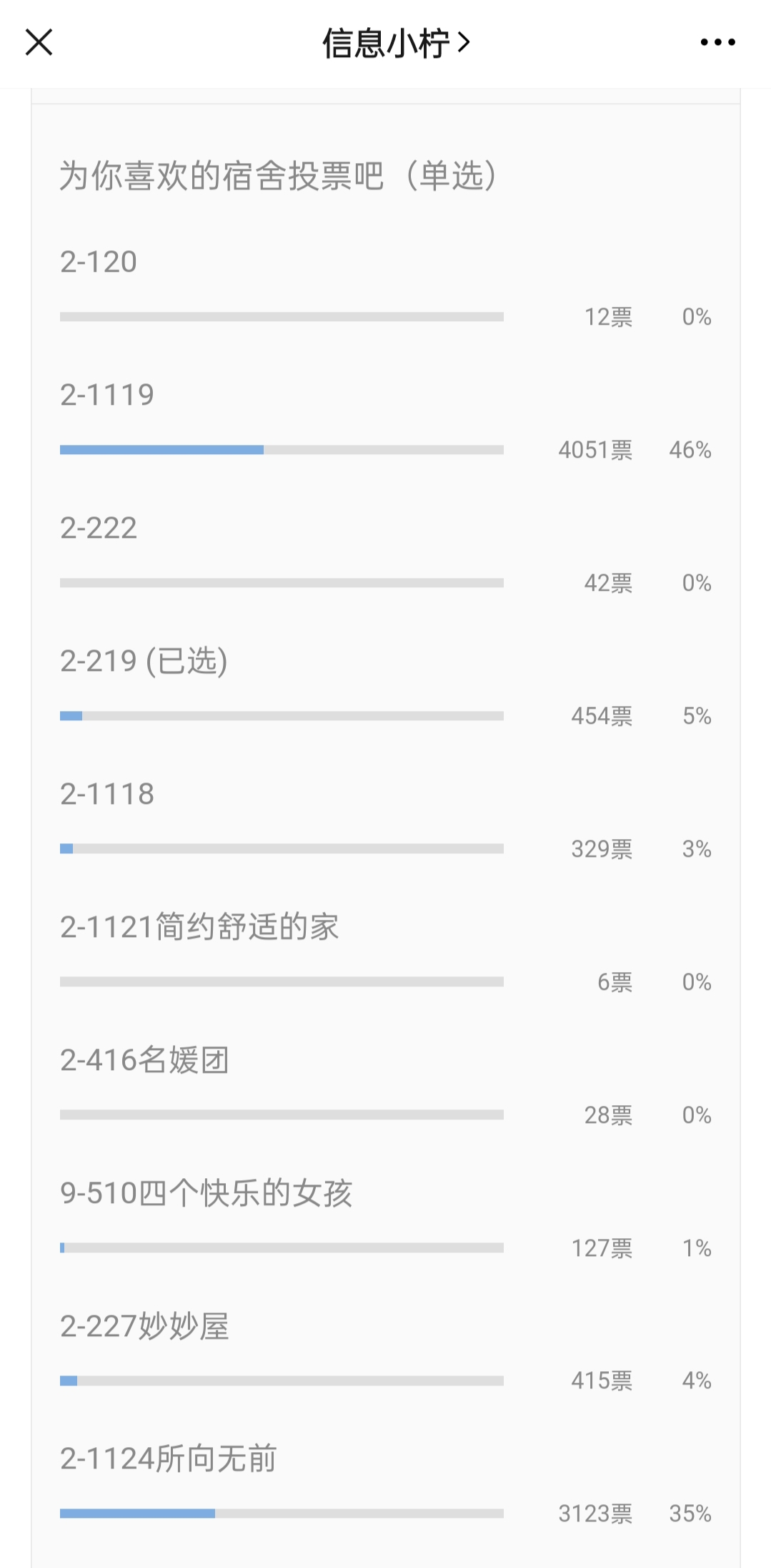 大赛分为初赛、决赛两个环节,首先,初赛面向全院在校员工开展,自愿报名,后经公司评定小组审议,从众多参赛宿舍中充分考虑以下条件:1.宿舍干净整洁;2.装饰美丽有设计感;3.宿舍设计有创新点;4.能呈现出“家”的温馨;5.宿舍文化特色突出,评选出13间宿舍。最后,决赛通过网上投票的形式,经过激烈角逐,2-1119宿舍以4051票的高人气获得“最佳人气宿舍”荣誉称号,另外,根据票数高低评选出“五星级宿舍”4间、“四星级宿舍”6间。