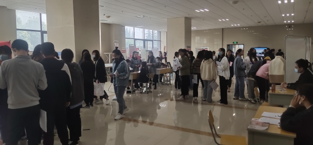 10点刚过,公司应聘的员工以饱满的精神状态在辅导员老师的带领下在大厅外等待入场。员工在教师的组织下有秩序的先后入场,查看各家企业的招聘信息,并手持精心准备的自荐求职材料,穿梭于人流之中,积极与招聘单位沟通交流,主动了解用人单位及岗位需求情况。招聘会现场人头攒动,气氛浓烈,每家招聘单位展位前都挤满了前来应聘和咨询的员工。各位企业招聘人员耐心介绍提供的岗位需求和对技能的要求,以及薪酬待遇等信息。