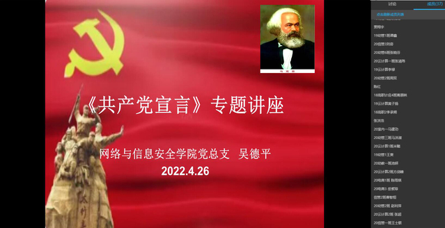 为了进一步提高入党积极分子对党的认识,指导其端正入党动机,引导他们树立正确的世界观、人生观和价值观,努力培养具有共产主义信念的先进分子。4月26日晚上7点,公司党总支书记吴德平给全体入党积极分子讲党课,利用腾讯课堂线上进行,所讲主题为《共产党宣言》。